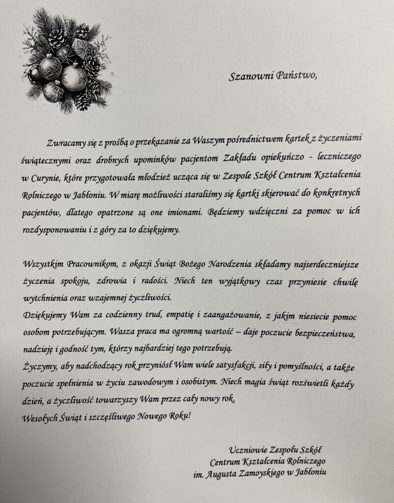 W tym świątecznym czasie dziękujemy uczniom Zespołu Szkół Centrum Kształcenia Rolniczego im. Augusta Zamoyskiego w Jabłoniu, za świąteczną niespodziankę – świąteczne kartki, które zostały skierowane imiennie do każdego naszego pacjenta oraz za słodkie upominki! ![]()